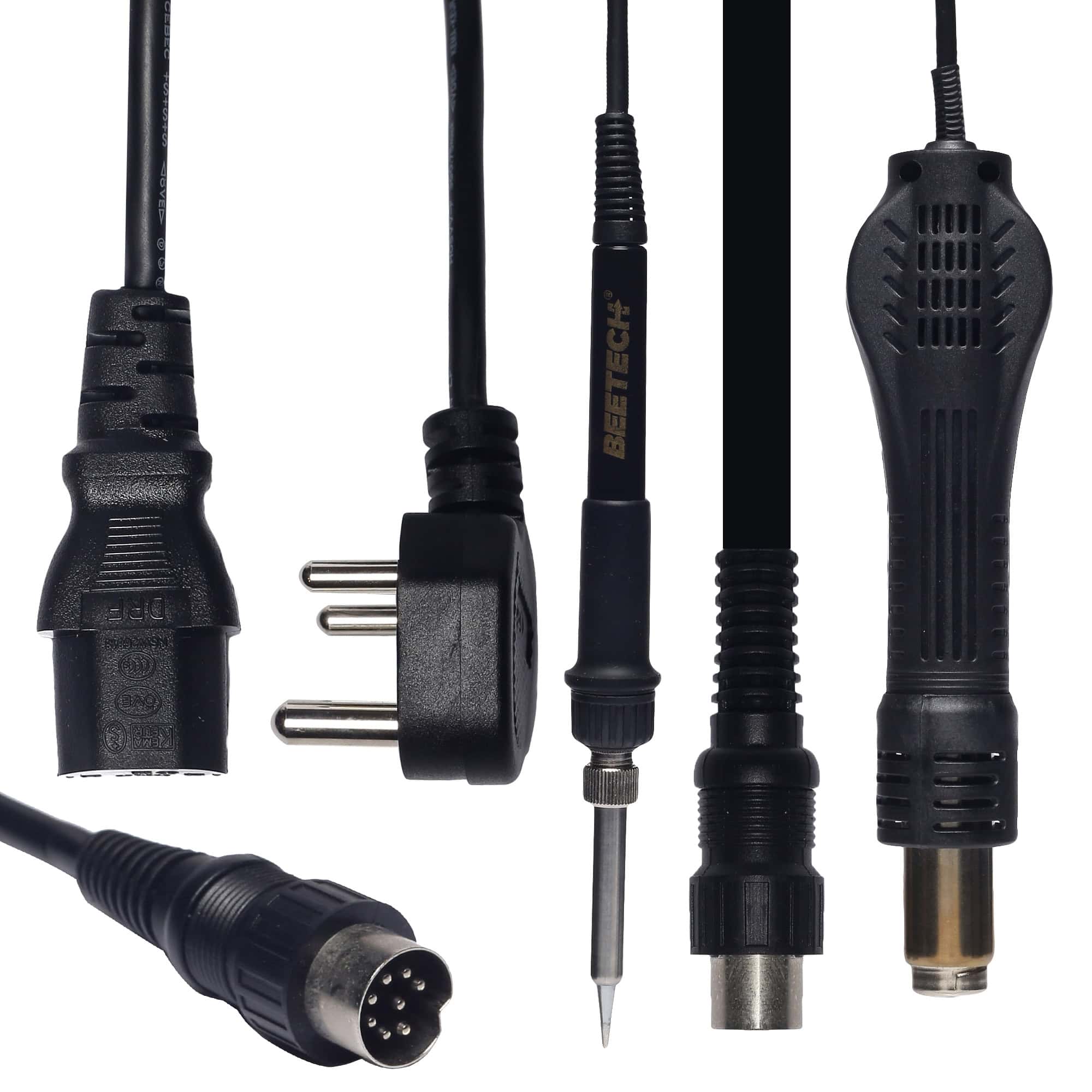 BEETECH B-706D-I 2 in 1 SMD Air Rework Station is a multi functional integrated de soldering maintenance system combined with reworking station and soldering station. The whole unit is controlled by a single microwave chip that ensures accurate temperature and air flow control. This unit has a heater lamp whose lights blinks on and off when the tip temperature reaches the set temperature.